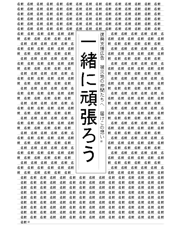 日青新聞で、被災地へのメッセージとともに義捐金も届けましょう。是非、周囲の仲間たちに広げ、たくさんの名前で埋め尽くしましょう。よろしくお願いいたします。