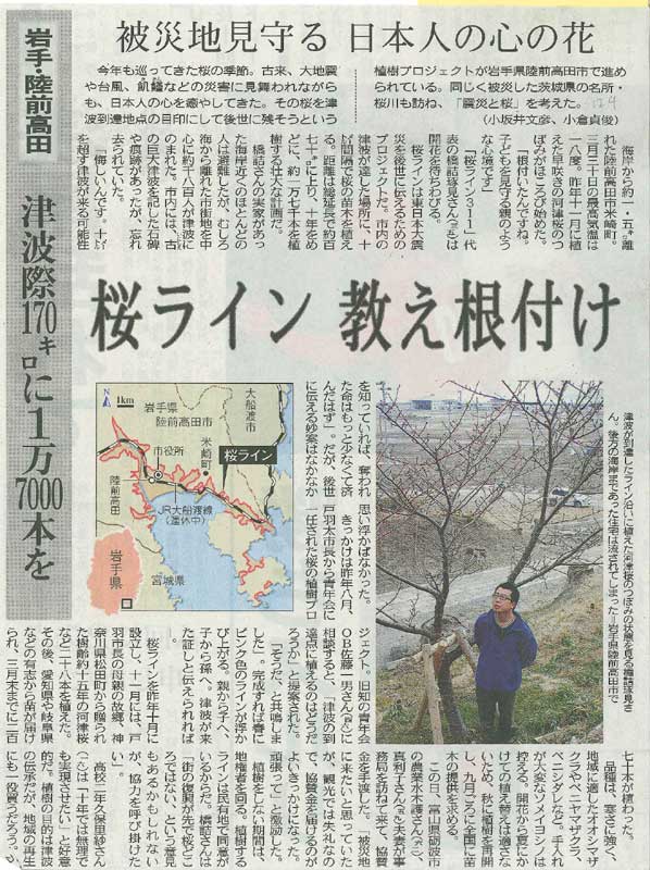 静岡県の川根町青年団は、地元の桜祭りで露店を出店、売り上げを全て川根茶にして大槌町に送ることを決めました。また、滋賀県マキノ町青年団と高島市青年協議会は、陸前高田市の桜ライン311への支援のため4日間にわたって街頭募金に取り組みました。