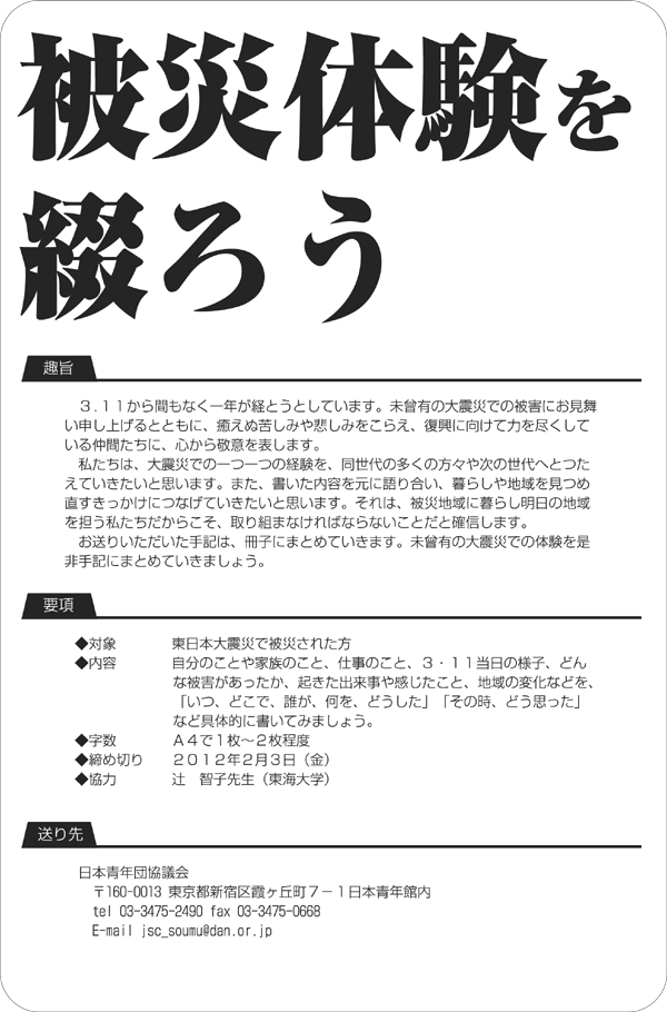 日青協では現在、以下の通り被災体験の記録をよびかけています。今回の大震災の被害をまとめ、記録に残す過程を通じて自分自身や地域と向き合うきっかけにつなげていきたいと思います。青年団に限らず、是非この取り組みを広げていきましょう。